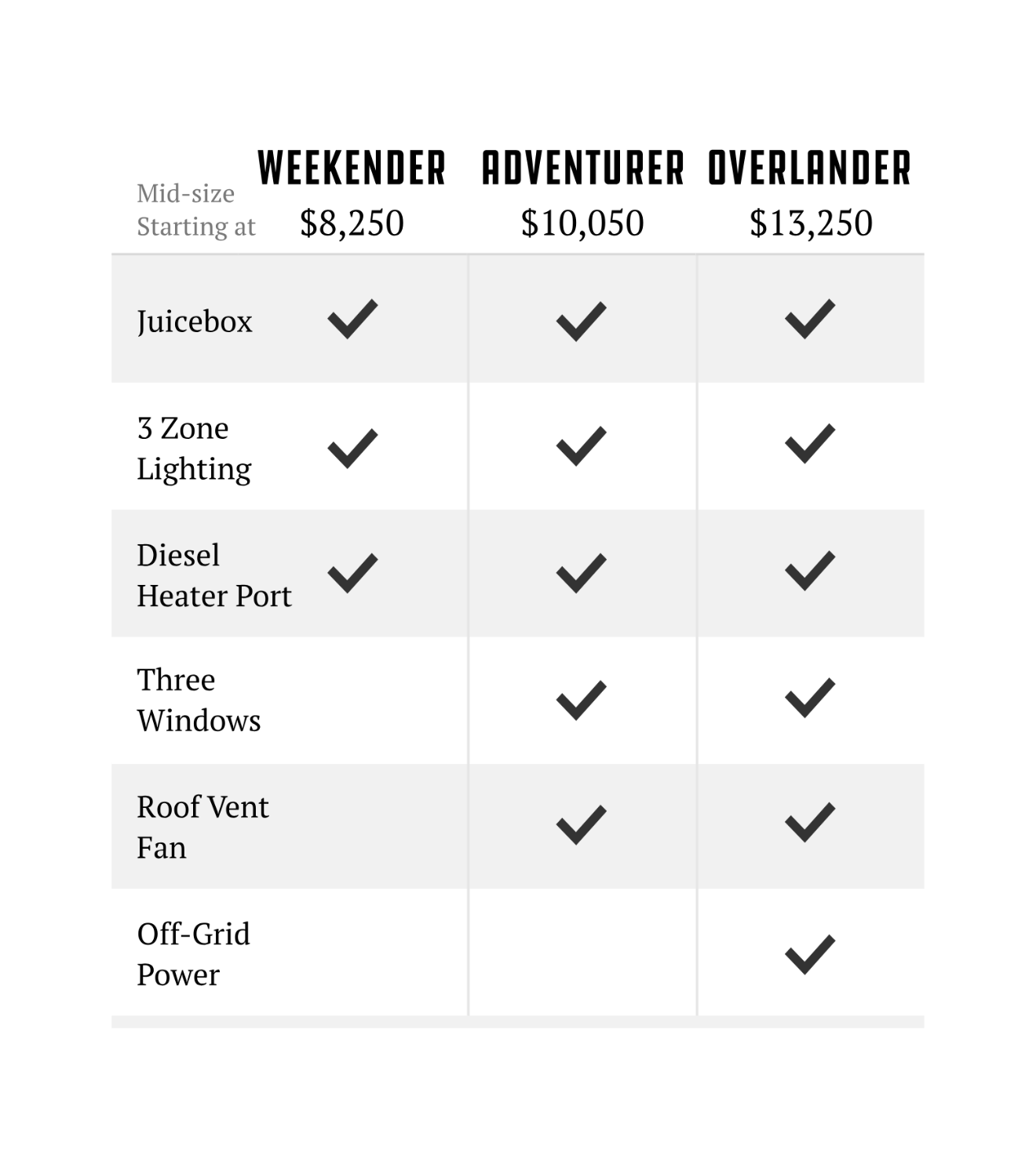 Starting at only 400 lbs, they won't weigh your truck down or kill your gas mileage, ensuring you can truly go anywhere. Choose from one of their four Base Builds - Baseline, Weekender, Adventurer or Overlander, and then customize to your heart's content.